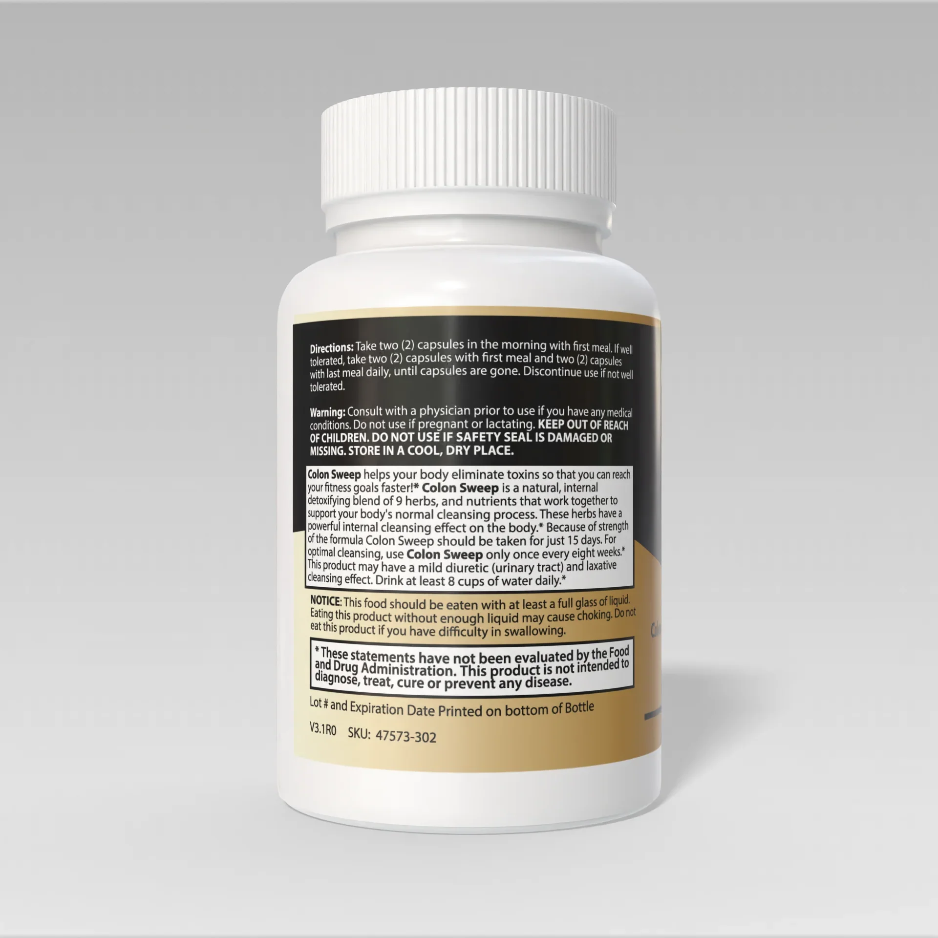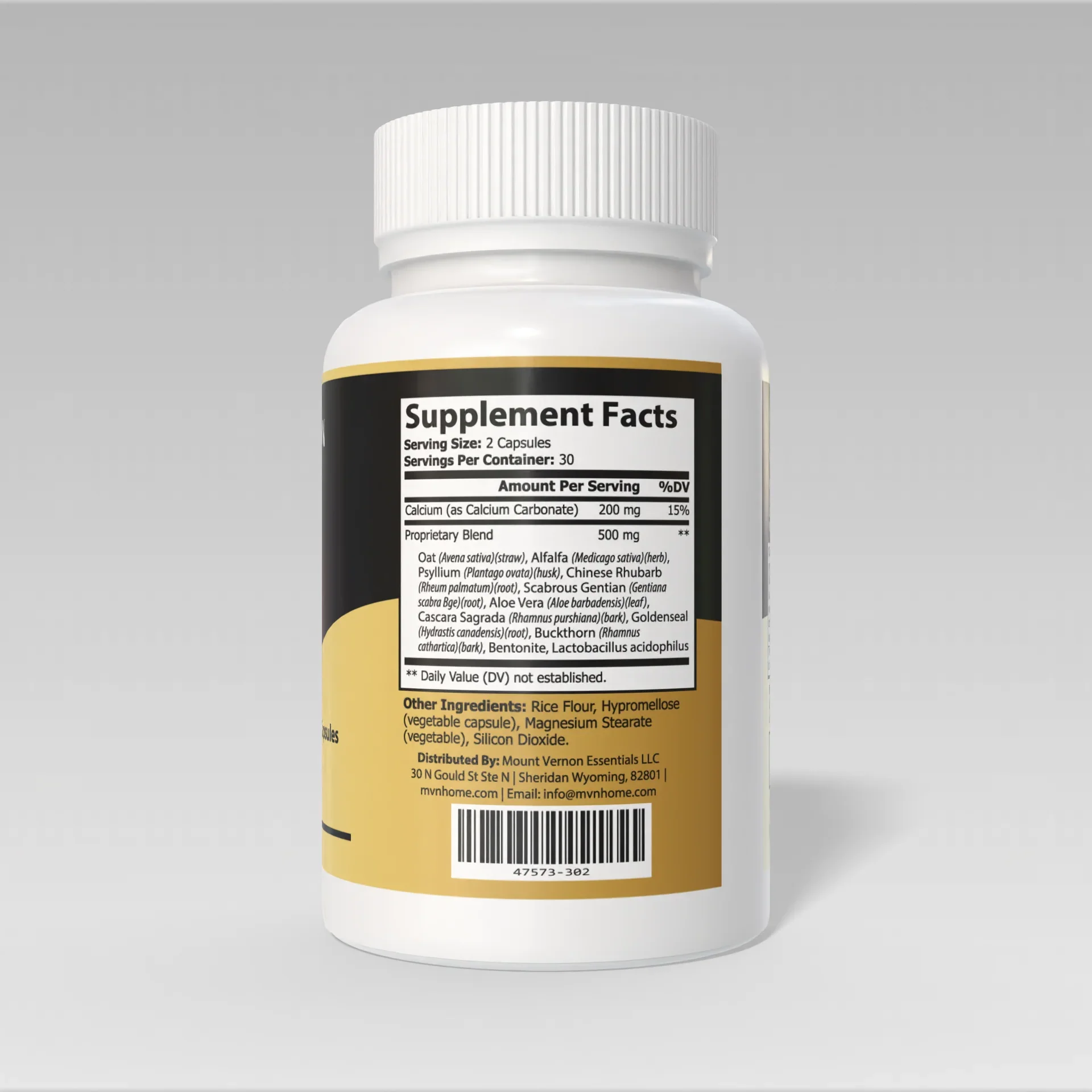Proprietary Herbal Blend – 500 mg: Oat Straw, Alfalfa, Psyllium Husk, Rhubarb, Aloe Vera, Cascara Sagrada, Gentian, Buckthorn Bark, Goldenseal, Bentonite, Lactobacillus Acidophilus