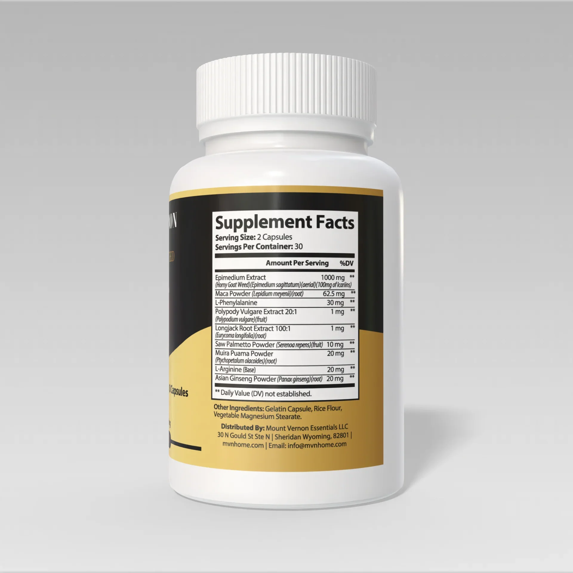 A herbal supplement featuring Horny Goat Weed (Epimedium) standardized to 100 icariins, combined with maca root, ginseng, muira puama, L‑arginine, and other botanicals. Formulated for both men and women, this blend is designed to support overall vitality and well‑being.