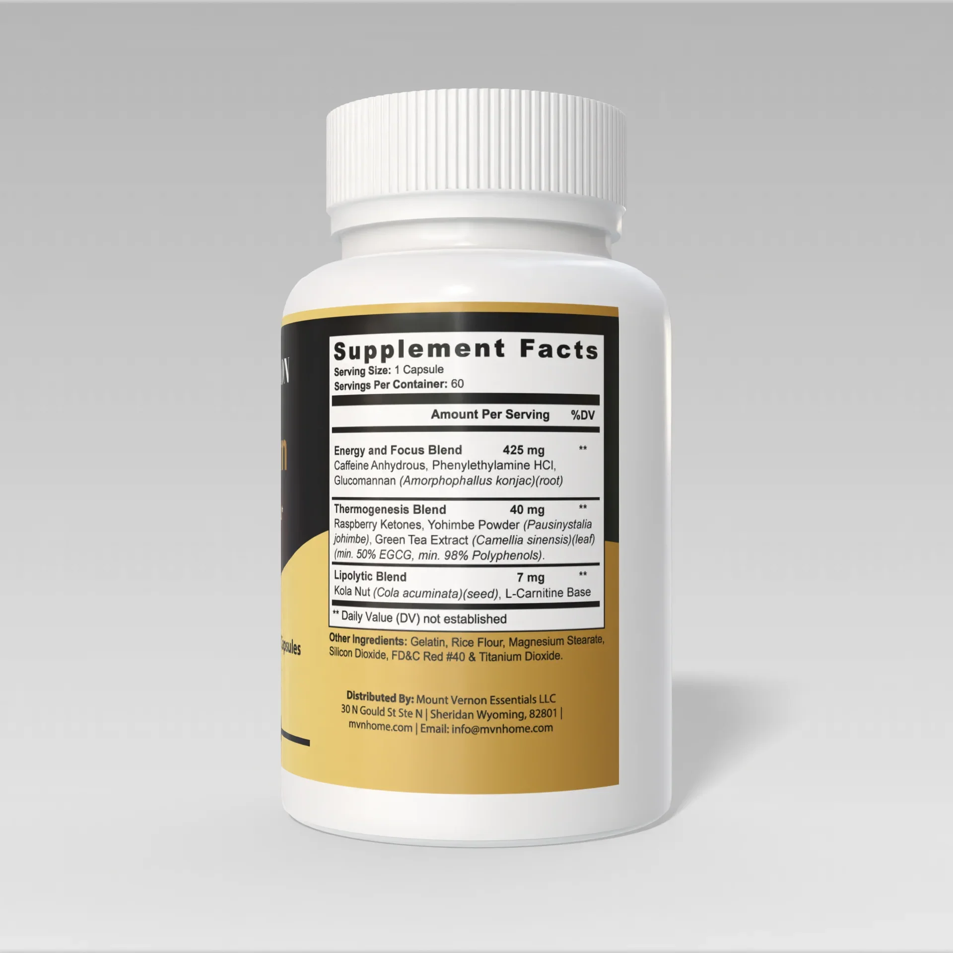 A dietary supplement containing caffeine, plant extracts, and amino acids in a blend formulated to support normal energy metabolism and overall wellness. Includes green tea extract, raspberry ketones, yohimbe, and L‑carnitine in convenient, once‑daily capsules.