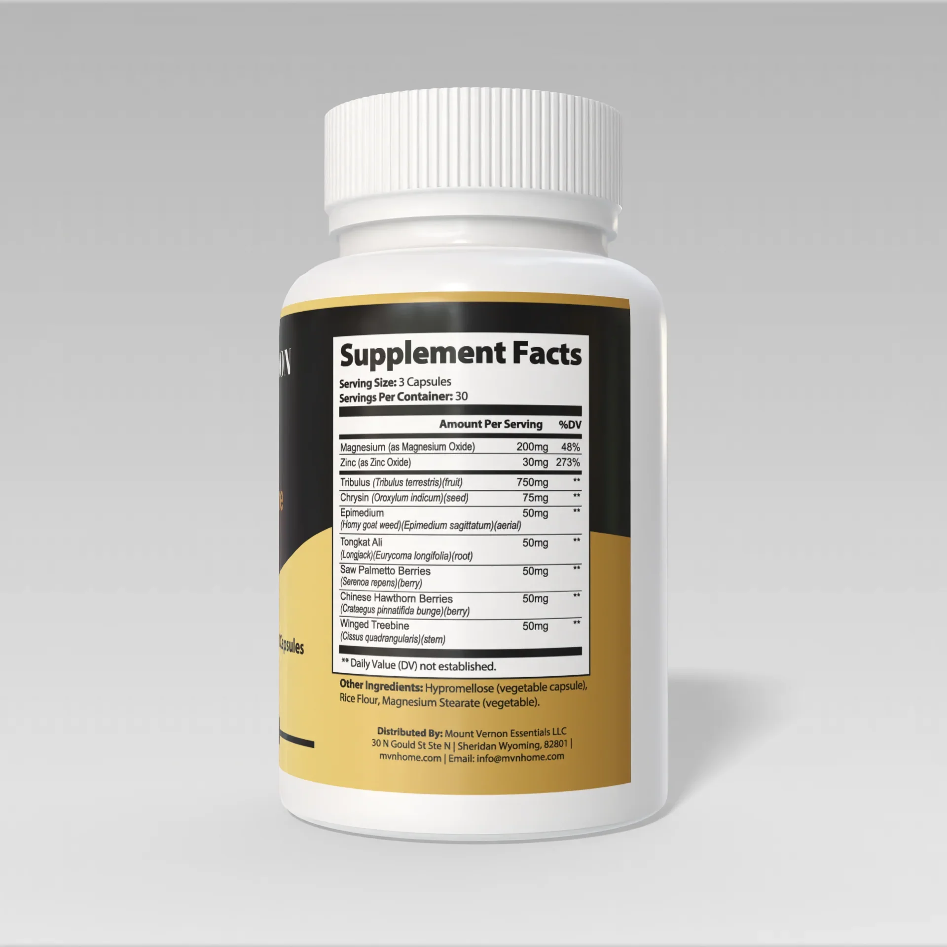 A dietary supplement made with a blend of minerals and botanical ingredients, including tribulus, tongkat ali, horny goat weed, zinc, and magnesium. Formulated to support men’s general vitality and wellness as part of an active lifestyle.